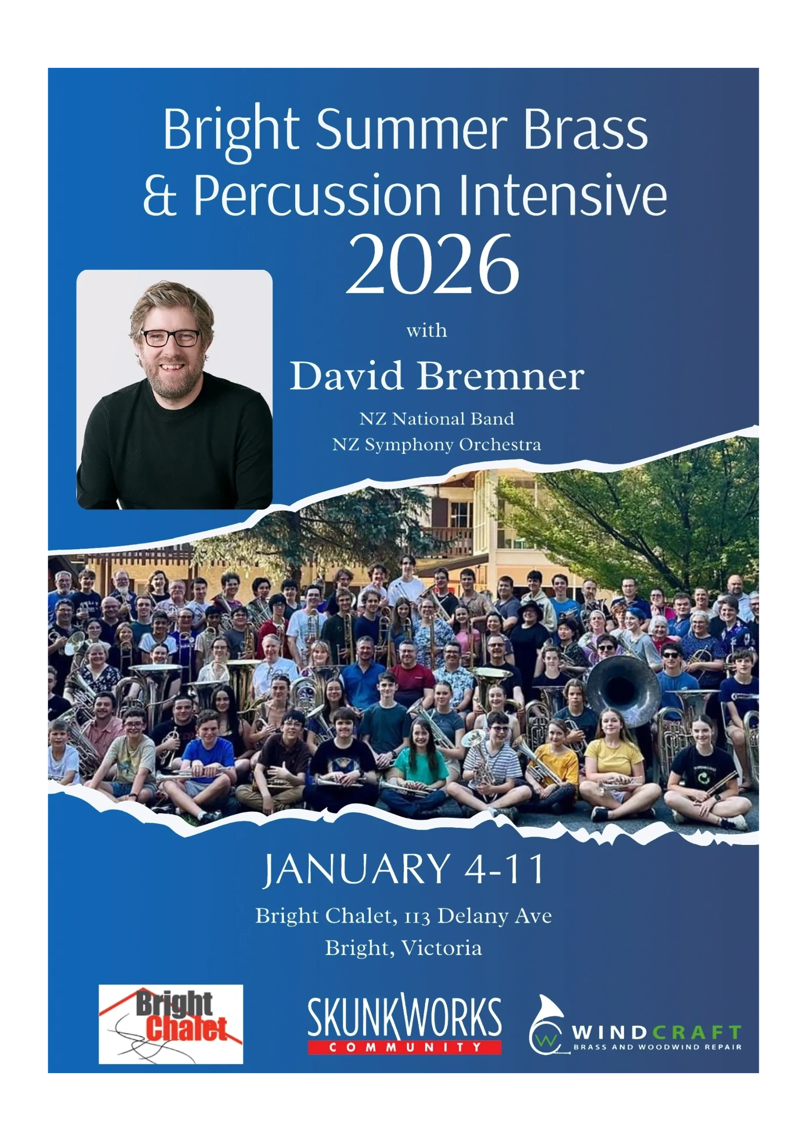 Our 2026 Bright Brass & Percussion Summer Intensive features internationally renowned conductor and trombonist David Bremner. Hailing from New Zealand, David has held the position of Principal Trombone with the NZ Symphony Orchestra since 2002 and is MD of the NZ National Band.